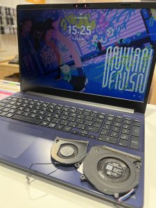 | 修理内容 | ファンからカシャカシャと異音、ホコリ詰まりではなくファン自体がコイルの破損で交換となりました。 パソコン自体の年代で決まるものでもないので、購入からすぐ不調が起きてしまうパーツもなくはないです… ファンはセット単位で交換になることが多いです。 |